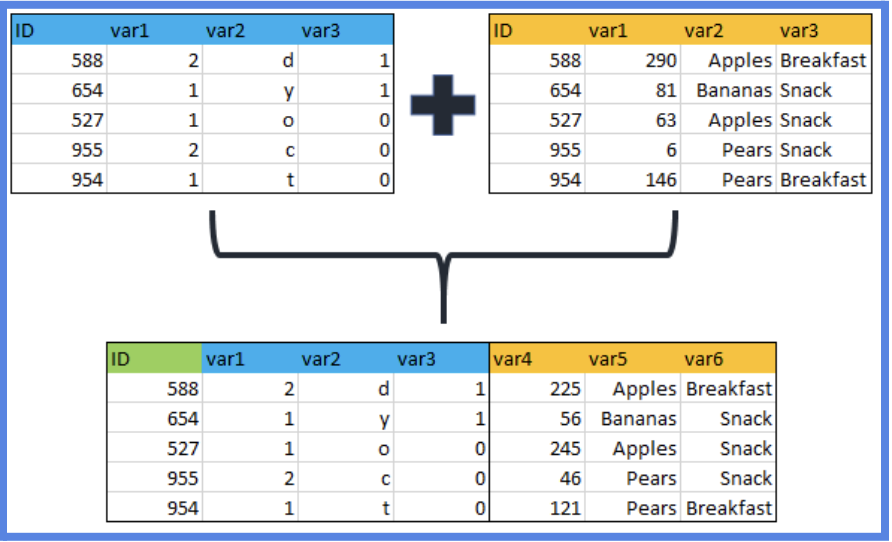 To merge two datasets horizontally, that is, to add columns, we typically use the merge() function in base R or the join functions from dplyr. In most cases, we join two datasets by one or more key variables (for example, id).By default, R executes an inner join when merging data sets. This means it will keep only the rows where the key variable matches in both datasets. But there are other types of joins you can use depending on what you want to keep: